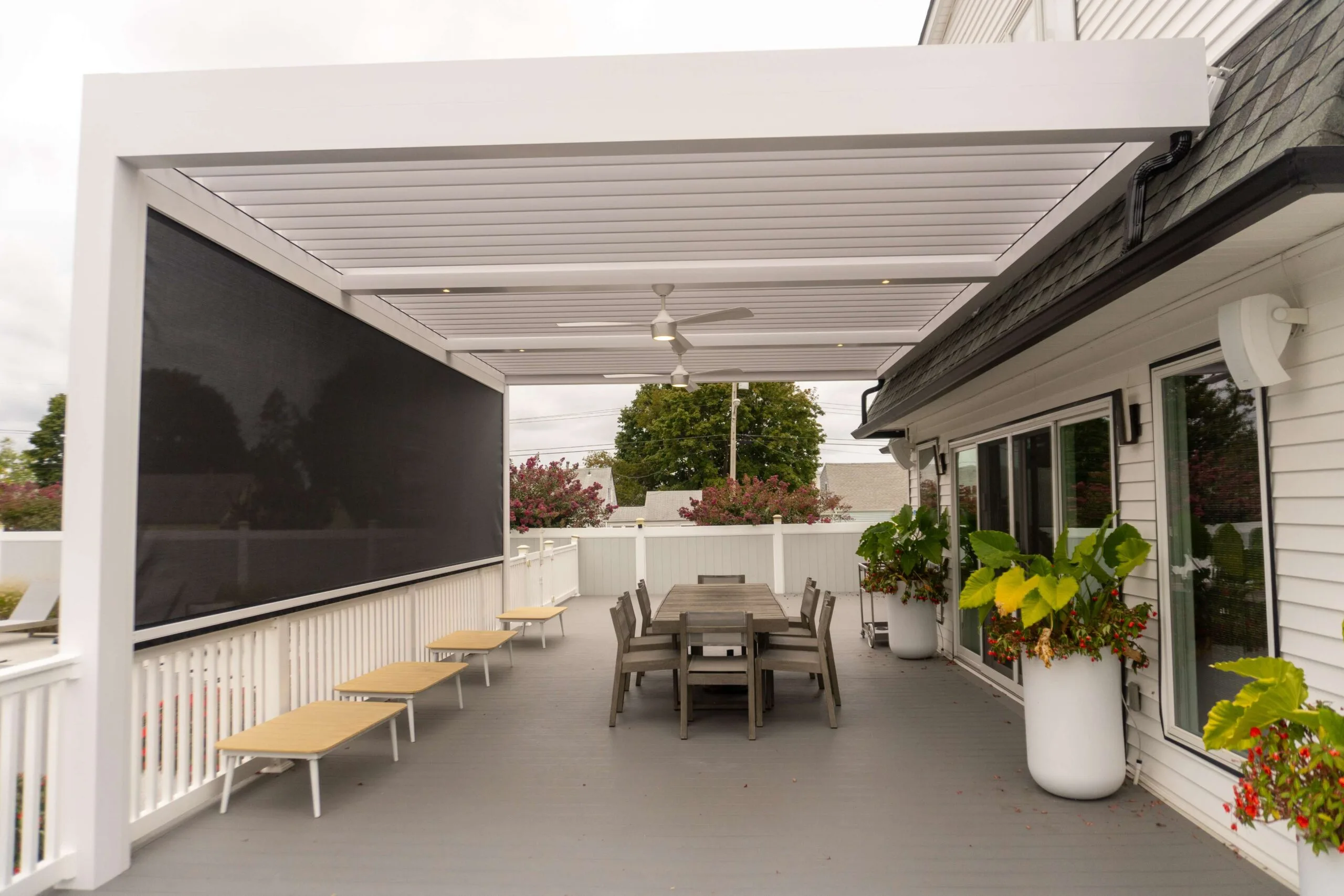 The client wanted a deck-mounted louvered roof system to enhance their backyard in Deal, New Jersey. Their goal was to enjoy their deck throughout the year without worrying about weather conditions. The louvered roof system provided the perfect balance of adjustable shade and reliable rain protection, giving them exactly what they needed.