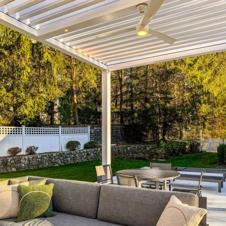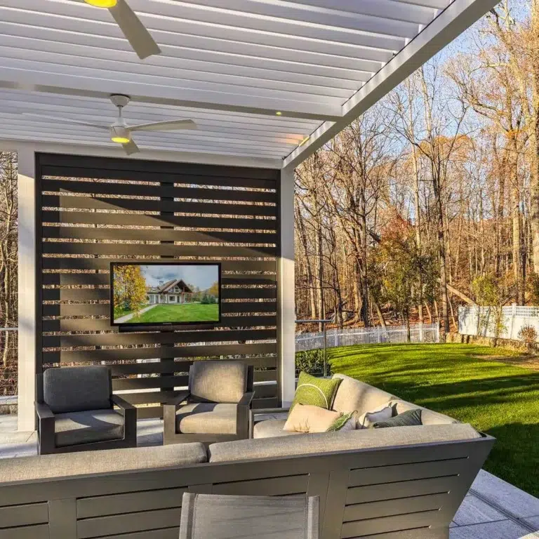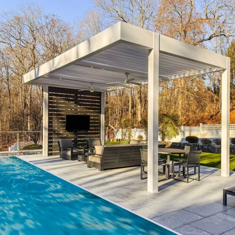Objectives and features: The client requested a poolside motorized pergola equipped with a built-in privacy wall and a T.V. wall mount.