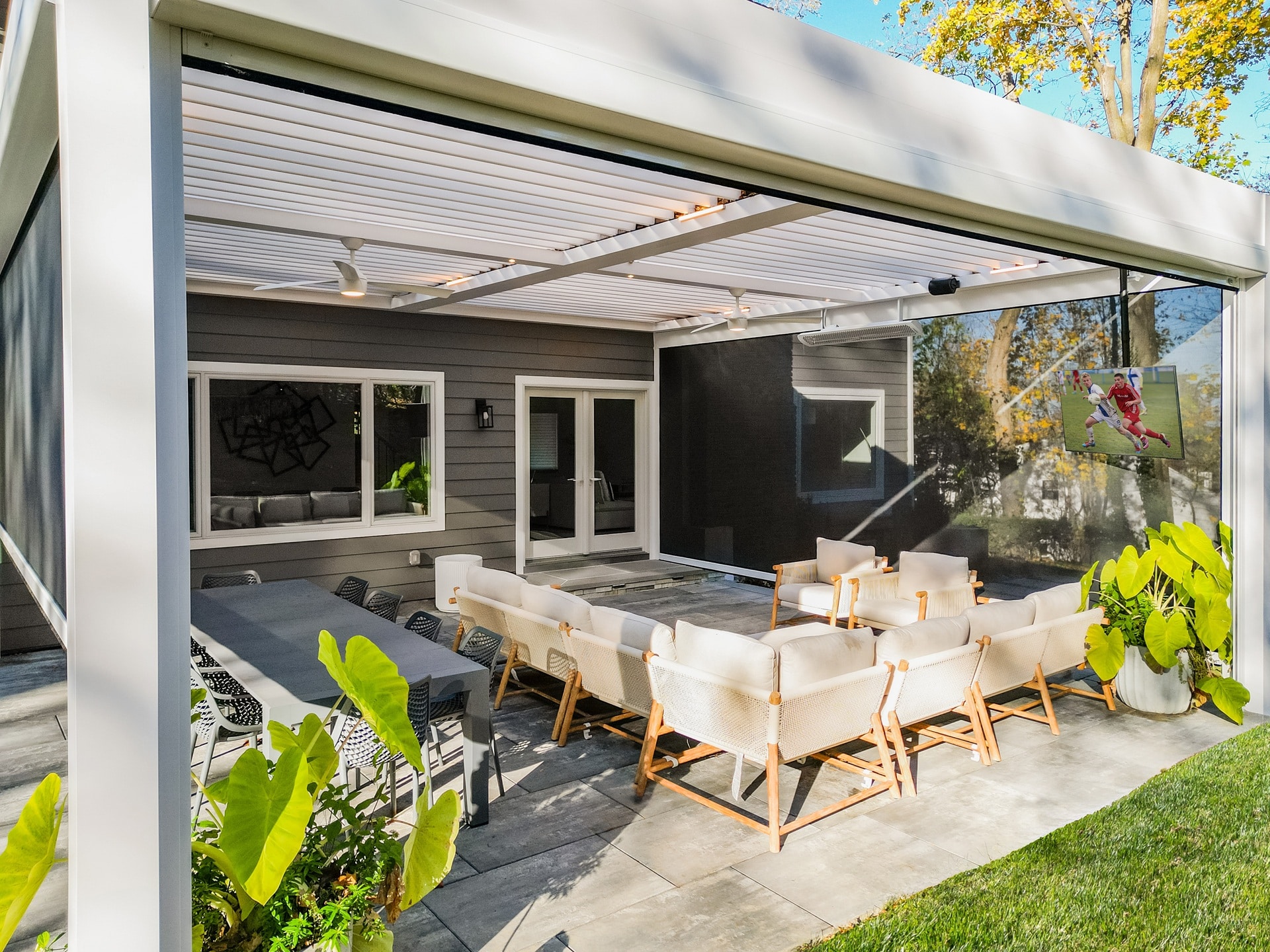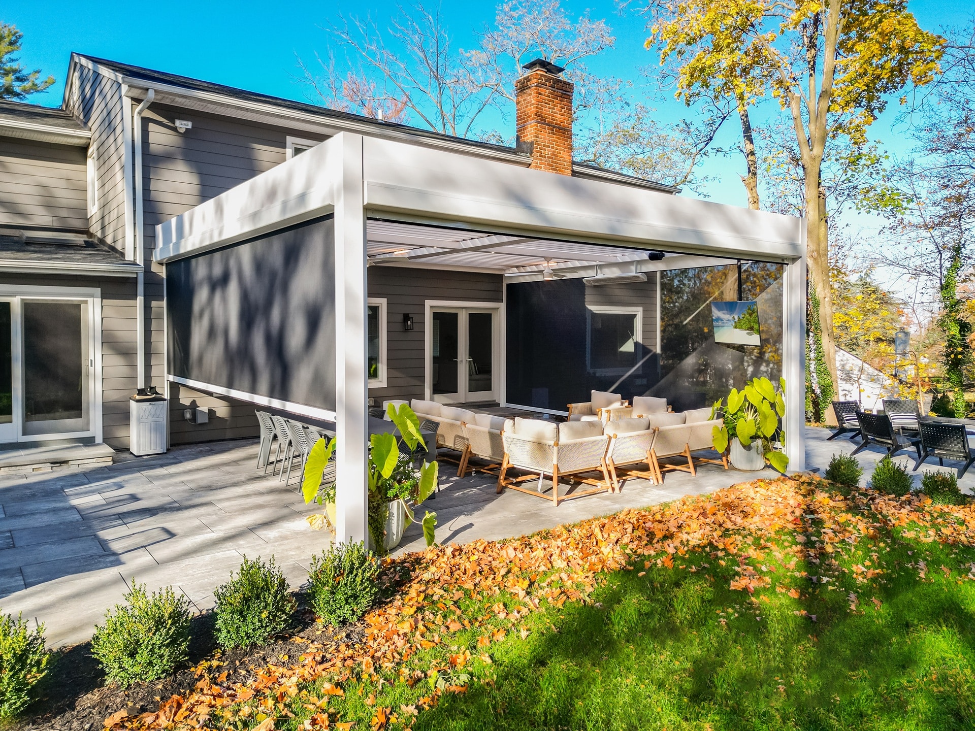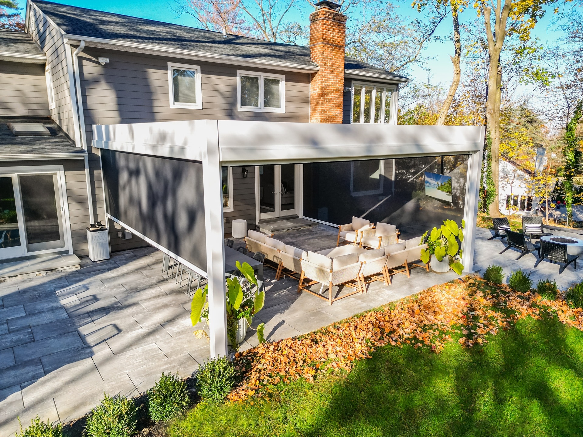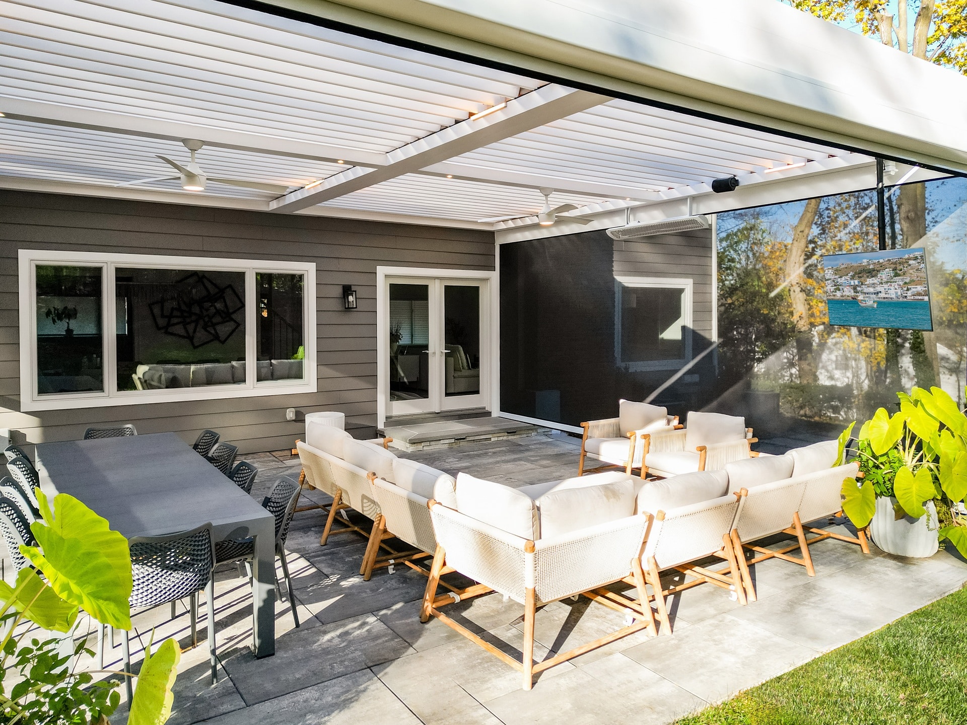 Objective and features: A wall-mounted motorized louvered roof system was installed with motorized screen shades and a built-in T.V. mount.