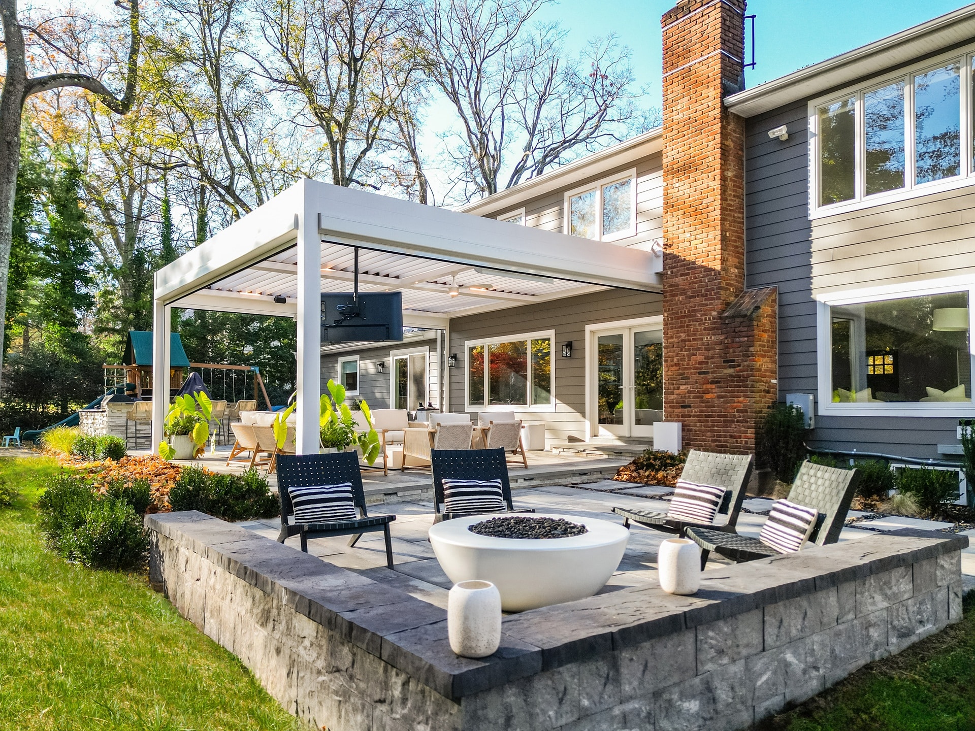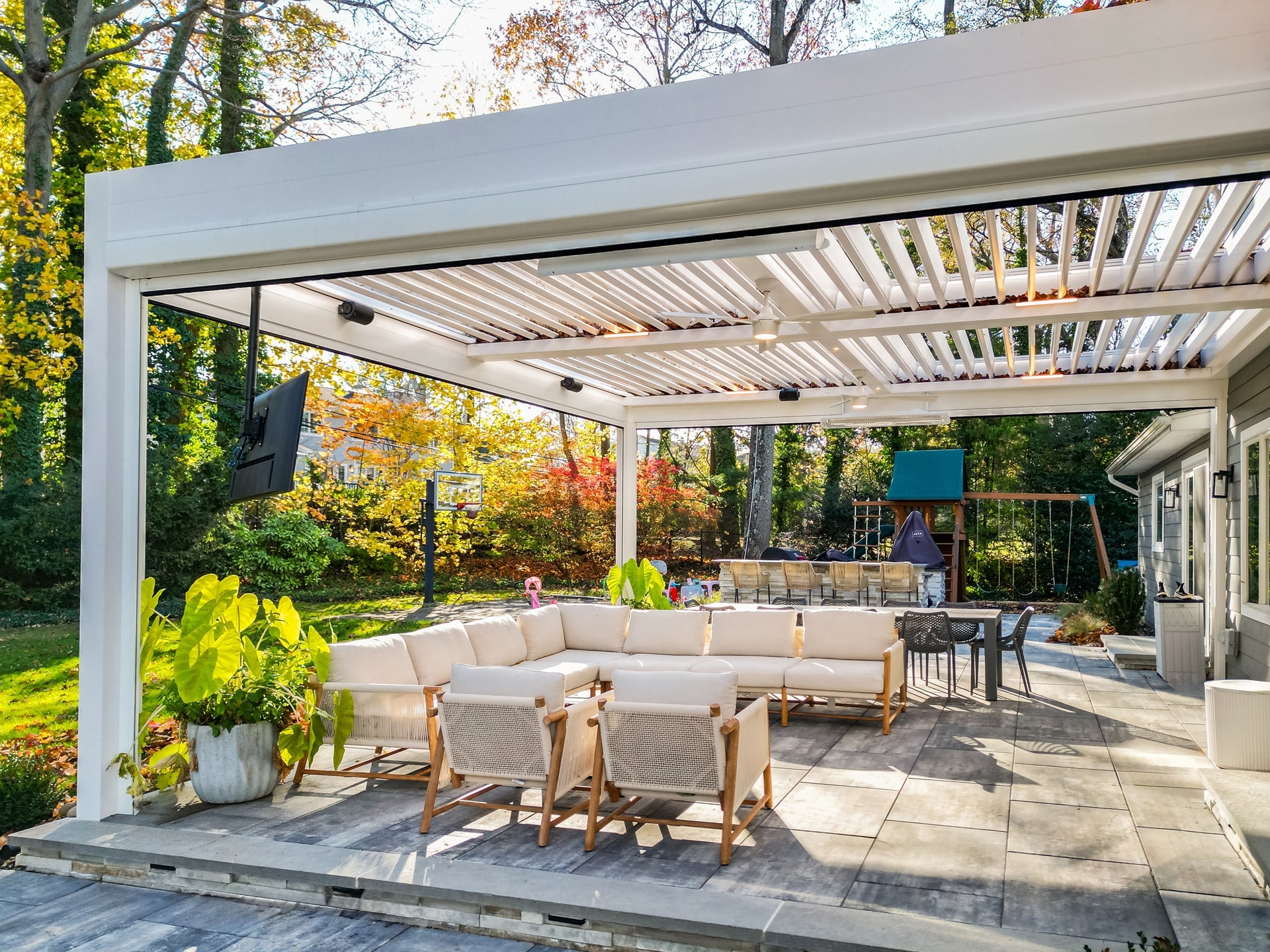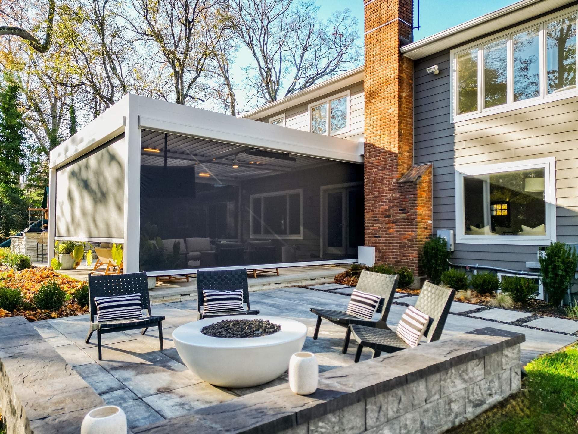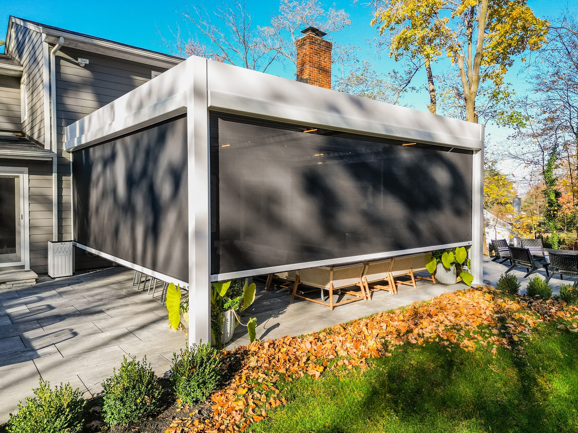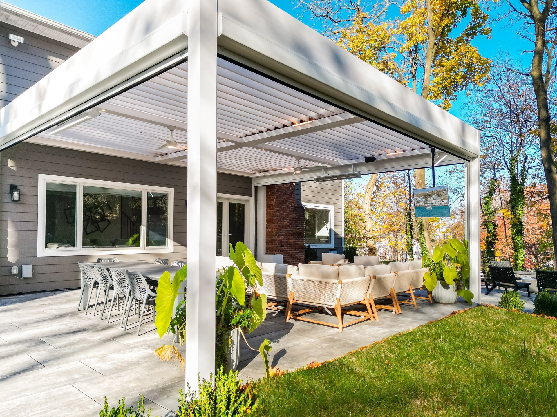 Objective and features: A wall-mounted motorized louvered roof system was installed with motorized screen shades and a built-in T.V. mount.