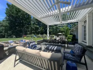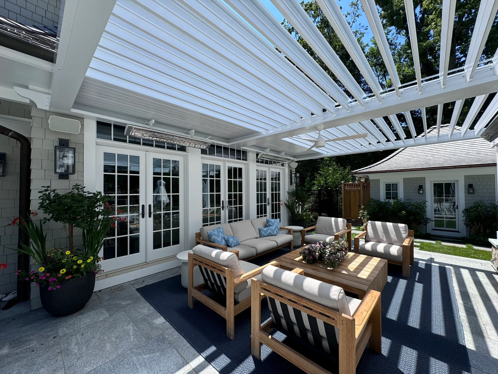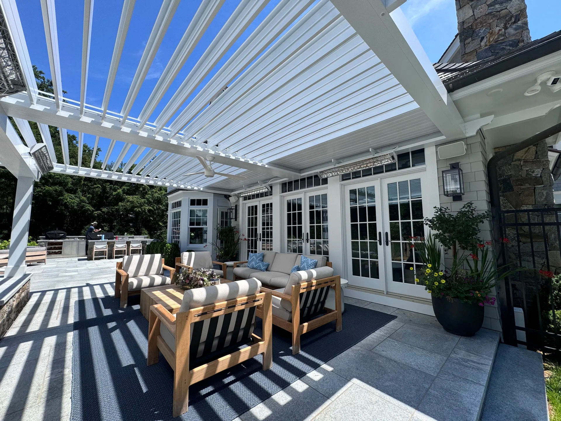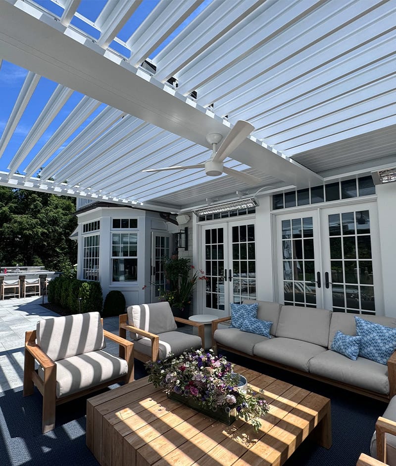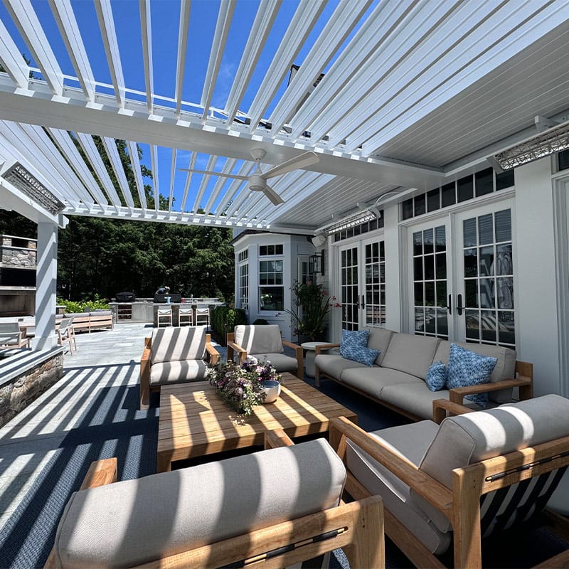 We installed a classic-style motorized louvered roof system in Riverside, Connecticut, bringing timeless charm to the home while blending seamlessly with its architecture. To enhance comfort year-round, the client also added Bromic 6000-watt heaters, allowing them to enjoy the outdoor space even during colder months.