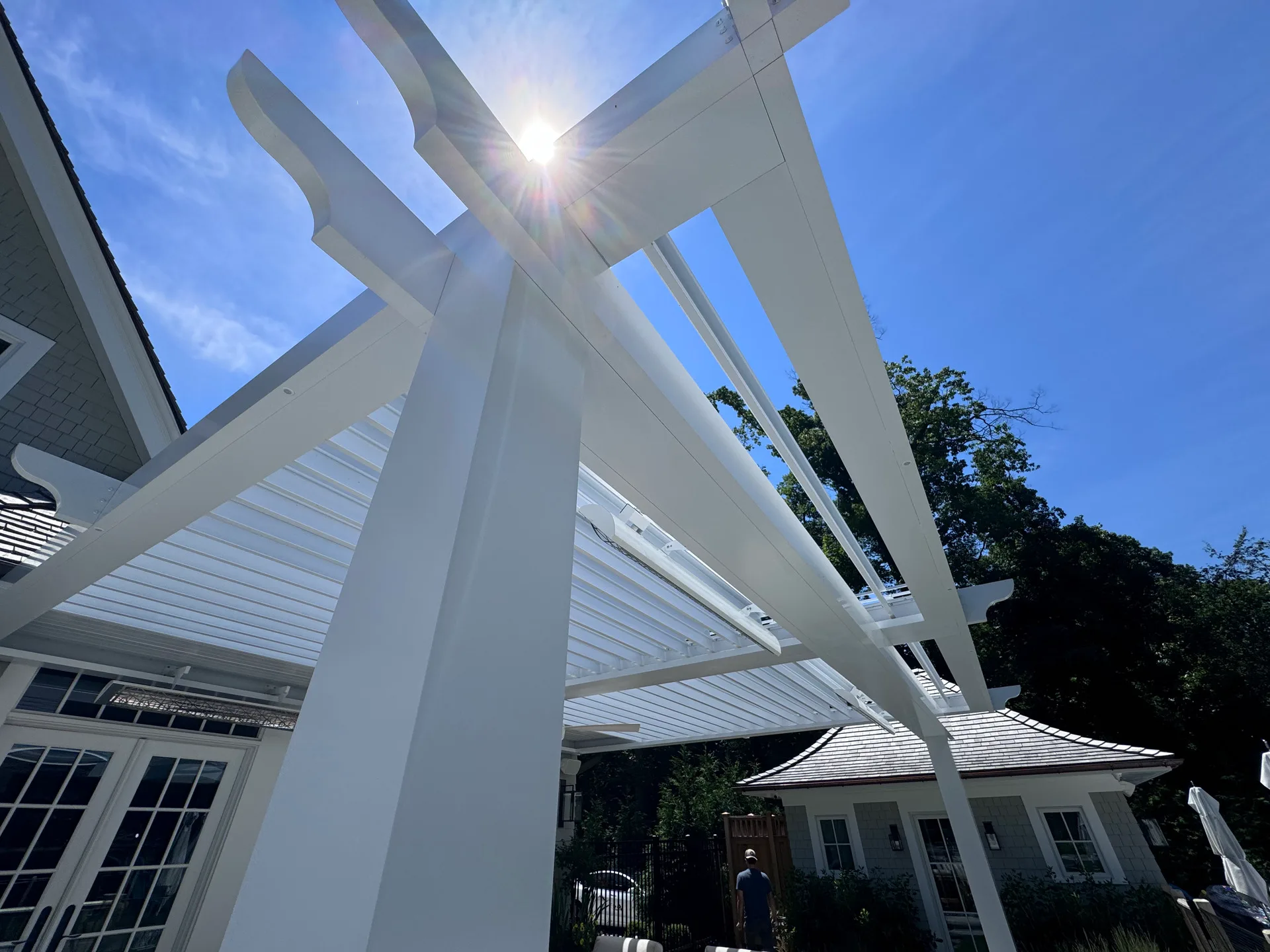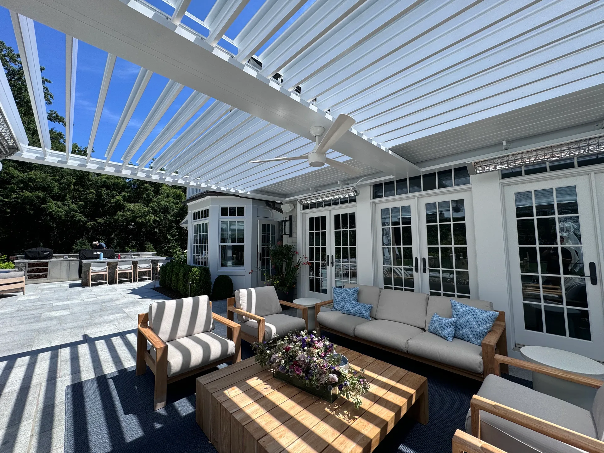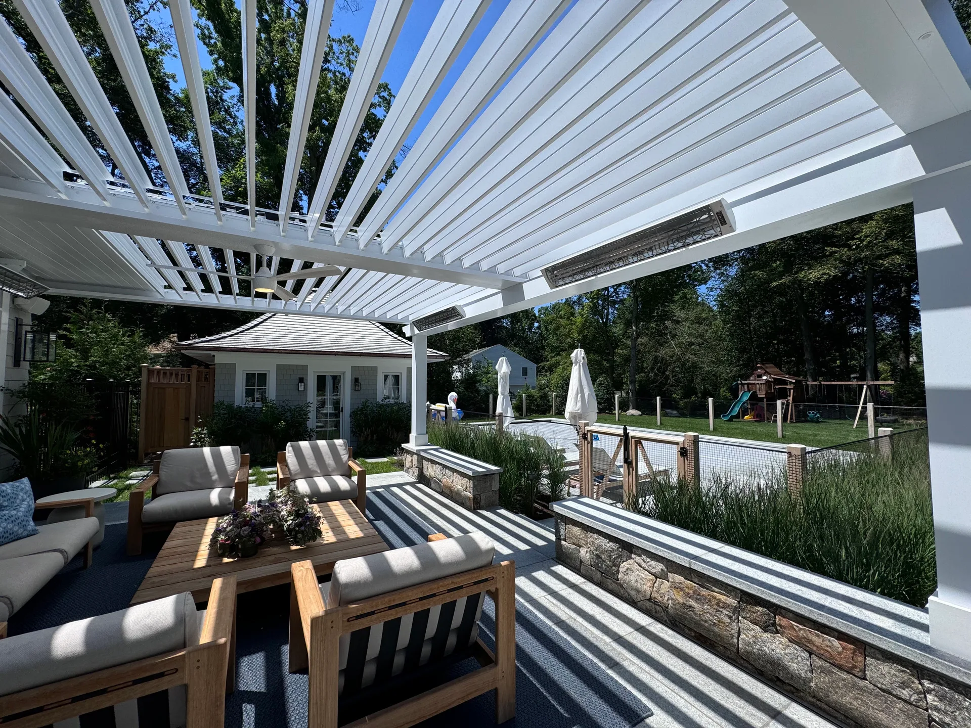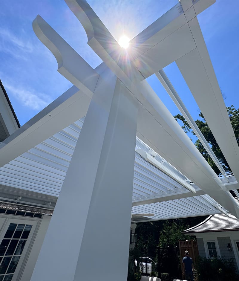 We installed a classic-style motorized louvered roof system in Riverside, Connecticut, bringing timeless charm to the home while blending seamlessly with its architecture. To enhance comfort year-round, the client also added Bromic 6000-watt heaters, allowing them to enjoy the outdoor space even during colder months.
