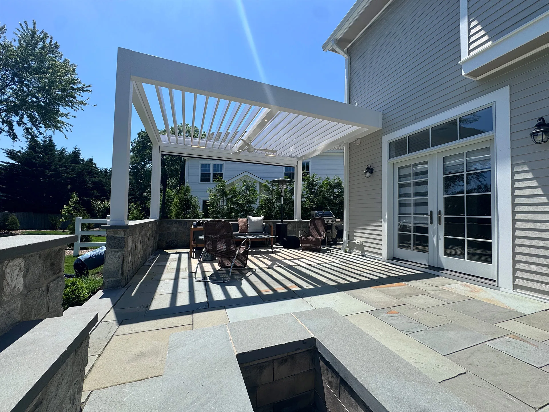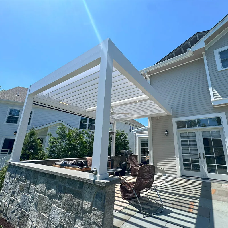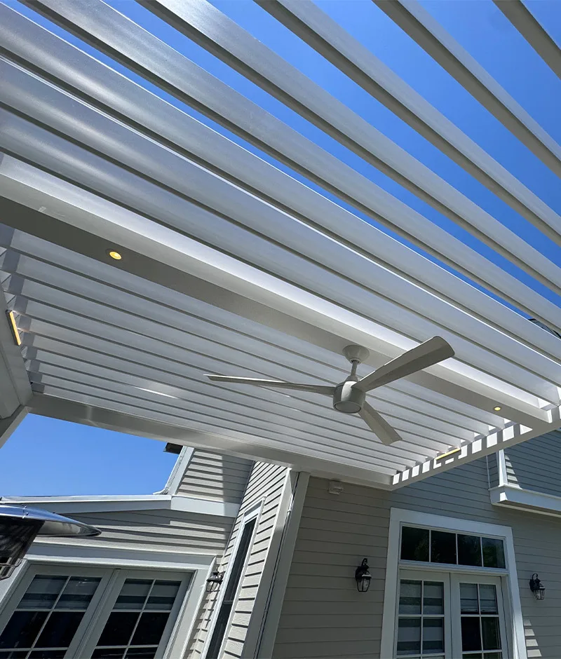 With remote-controlled adjustable louvers, they can now enjoy full shade or filtered sunlight with ease. The system not only delivers comfort and protection but also creates a striking striping effect that adds visual texture and elegance, turning the patio into a serene luxury retreat.