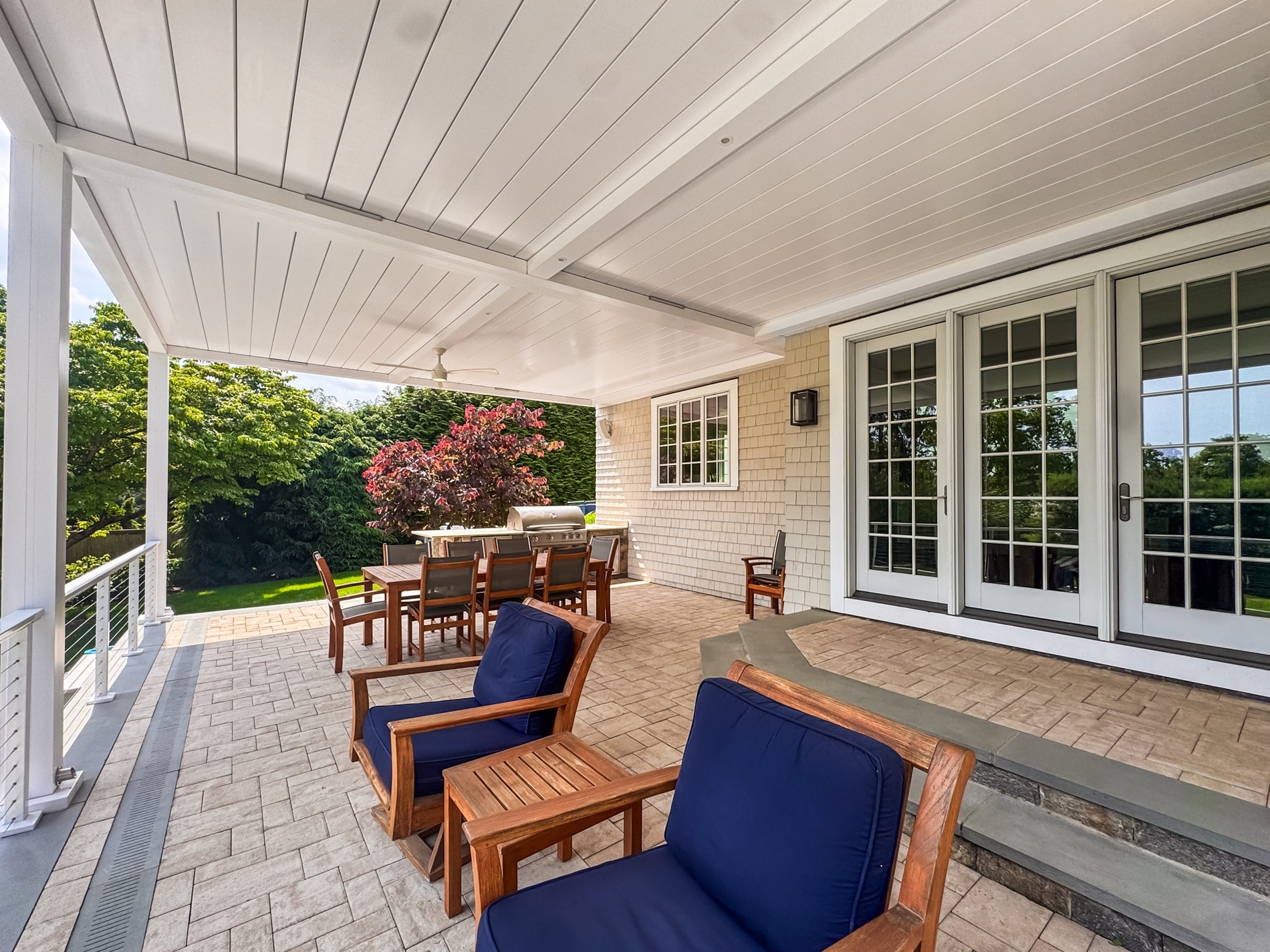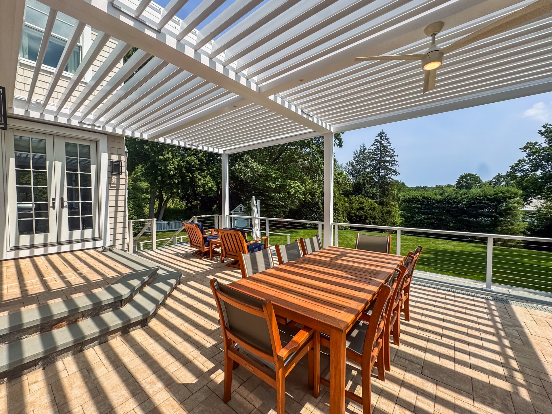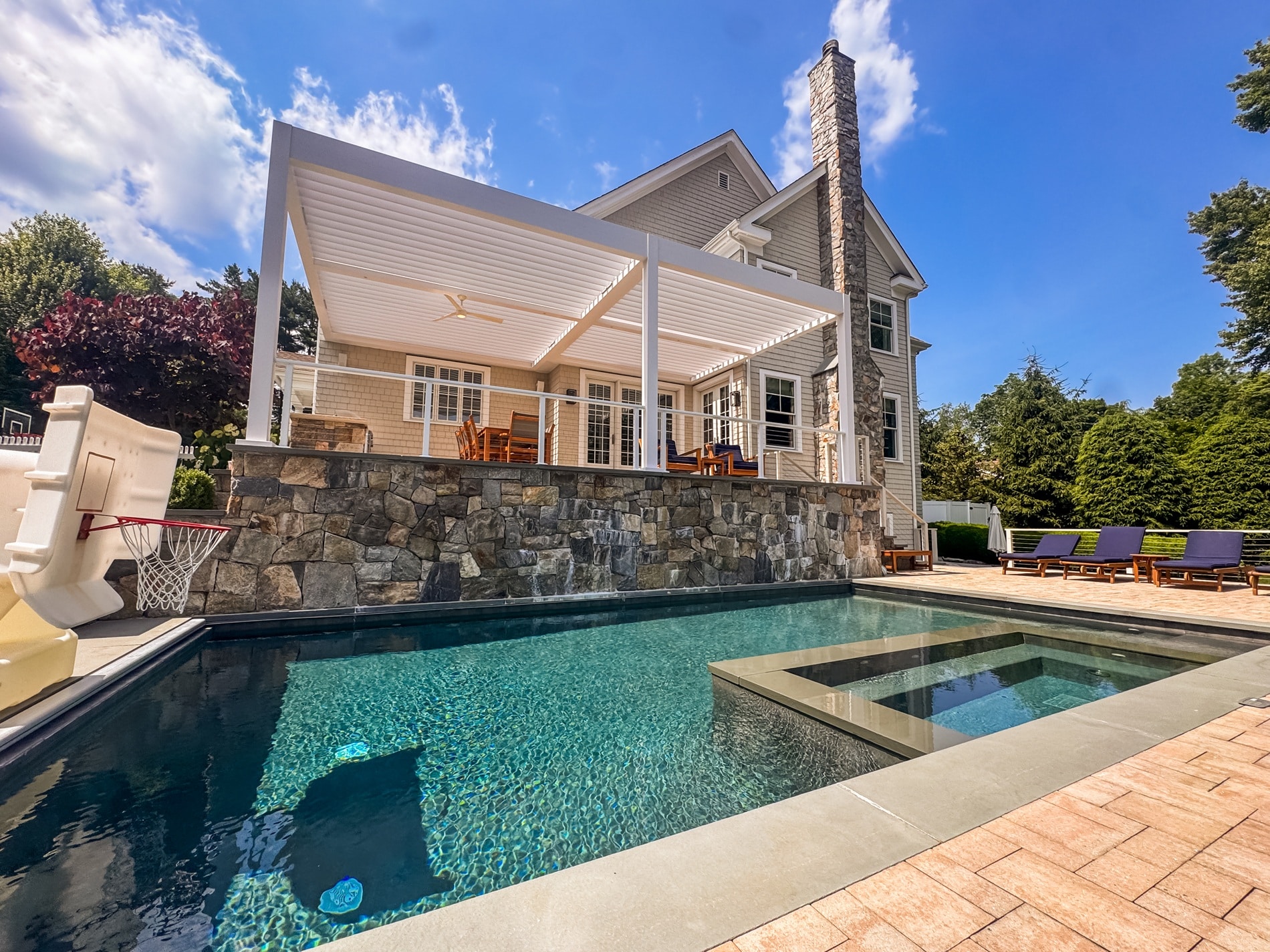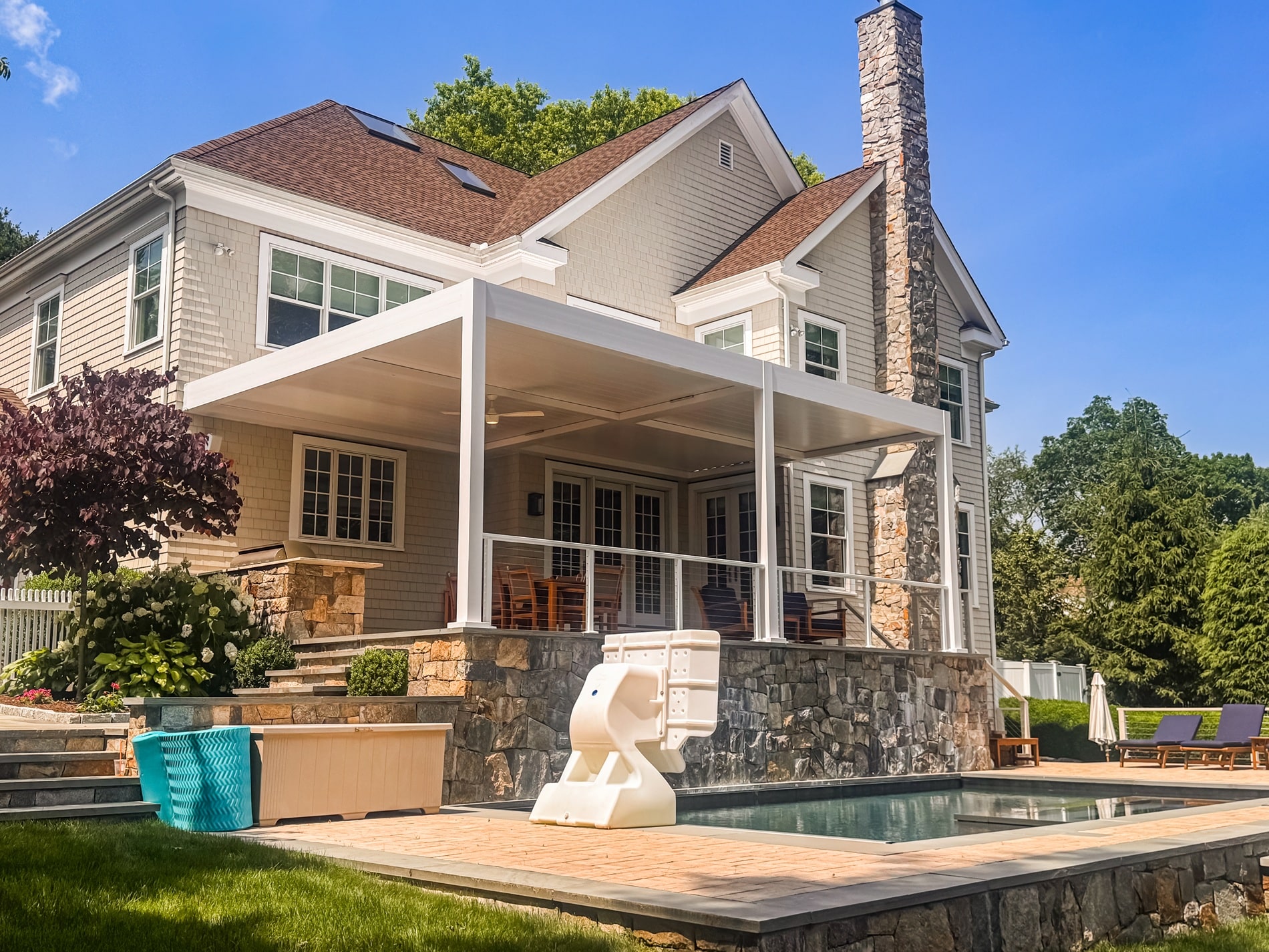 We designed and installed a custom motorized pergola over a poolside terrace for a private residence in Westport, Connecticut. The client wanted a sophisticated, weather-adaptive system that would extend their outdoor living space while blending with the poolside setting.