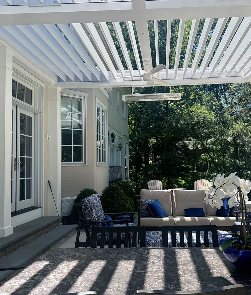 Beyond aesthetics, the system offered advanced functionality, giving the homeowners full control over shade and sunlight. To extend the usability of the patio, we also installed 6000-watt Bromic heaters, allowing the space to be enjoyed comfortably even during colder months.