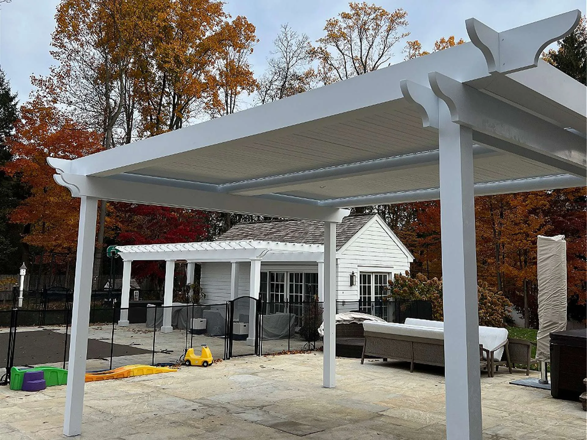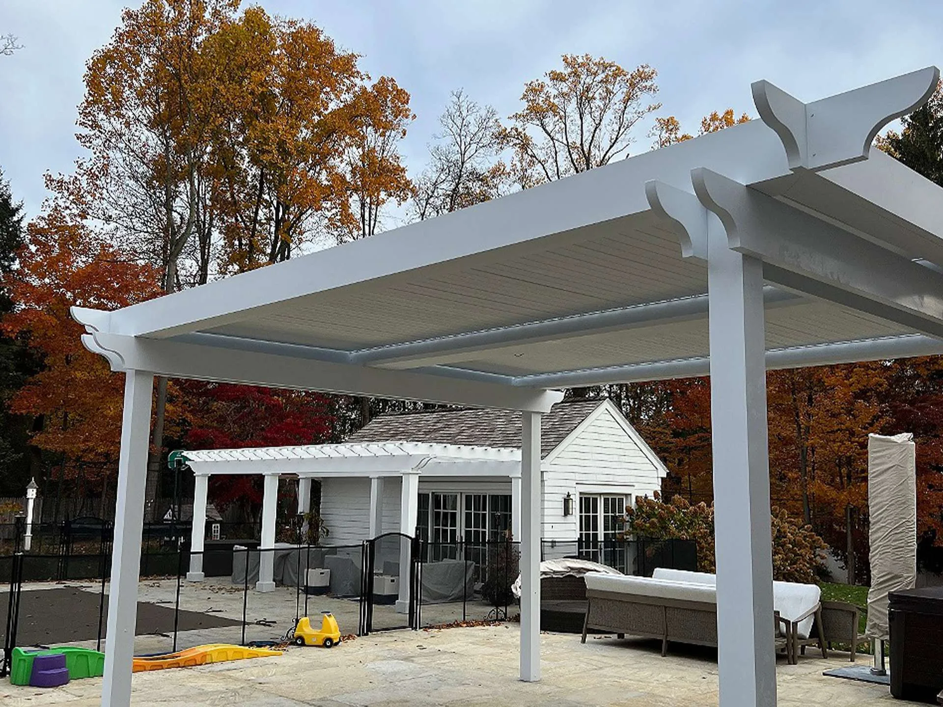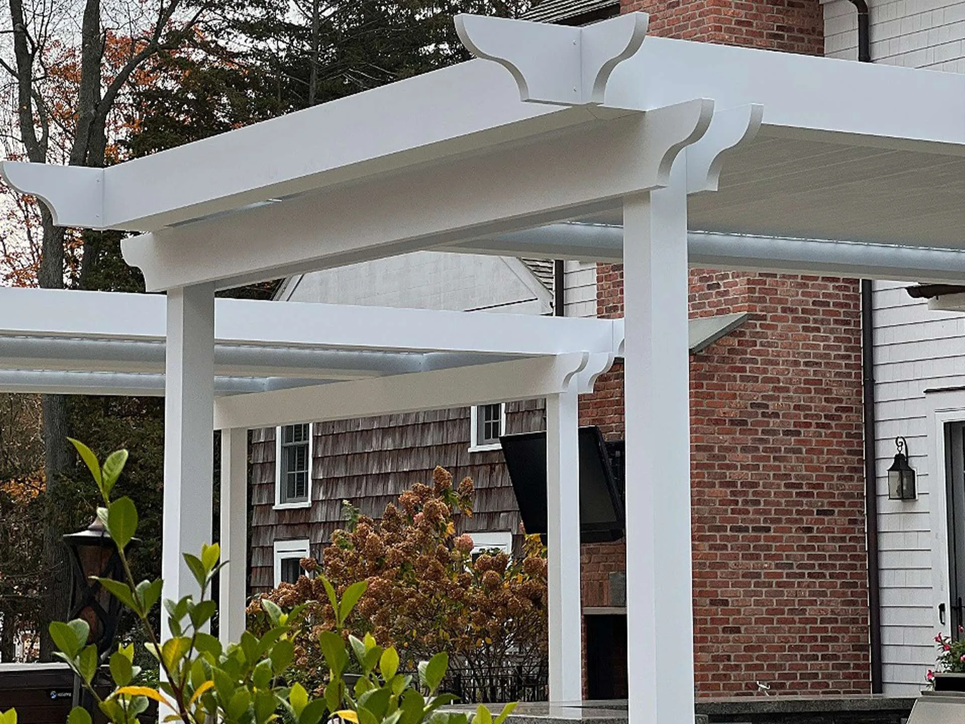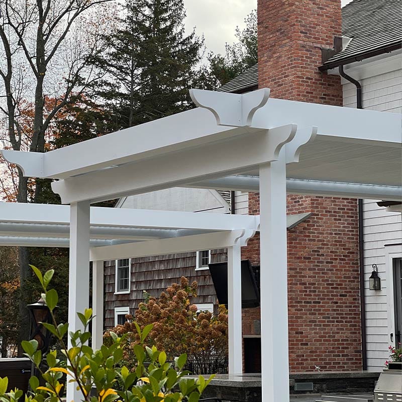 The homeowners envisioned a pergola system that would provide adjustable shade while still allowing natural sunlight to filter through. To achieve this, we installed a motorized pergola with custom classic-style end caps. These details gave the structure a timeless look that blends seamlessly with the home’s design, while still offering the modern convenience of motorized functionality.
