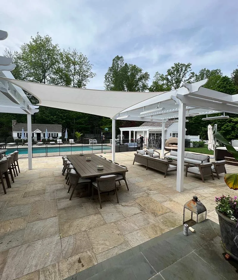 This client had a large outdoor patio with no natural shade and wanted a solution that combined both style and functionality. We had the opportunity to collaborate with local influencer Mar Jennings, known for his appearance on the TV show Life on Mars, where this installation was featured in a makeover episode. It was an exciting collaboration that also allowed us to connect more deeply with the Westport community.